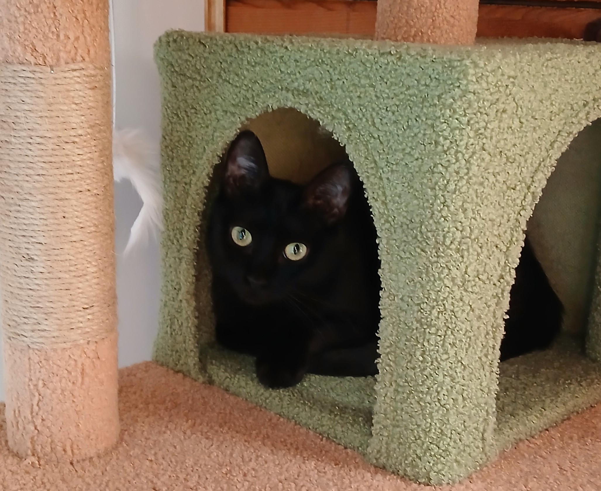 She loves her cat tree and treats. She is somewhat timid, an independent spirit, prefers attention on her own terms, but she can be very playful and affectionate. She is having some trouble getting along with our dog, though. She needs to feel safe and build trust with a gentle, sensitive person. She would really blossom in an adult home without a dog and maybe even as the only pet. She would like to bring her cat tree with her!