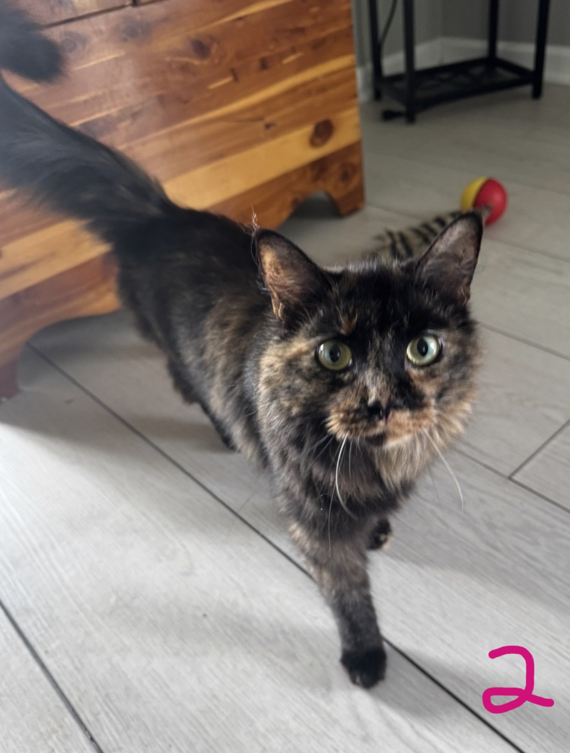 2. Maggie-female-short-haired tortie-born April 2023. She has been spayed. Vet records are available. Indoor cat. Maggie loves attention and is very playful.