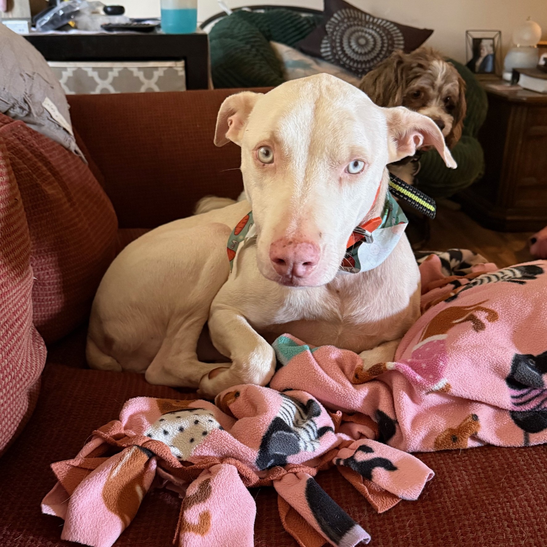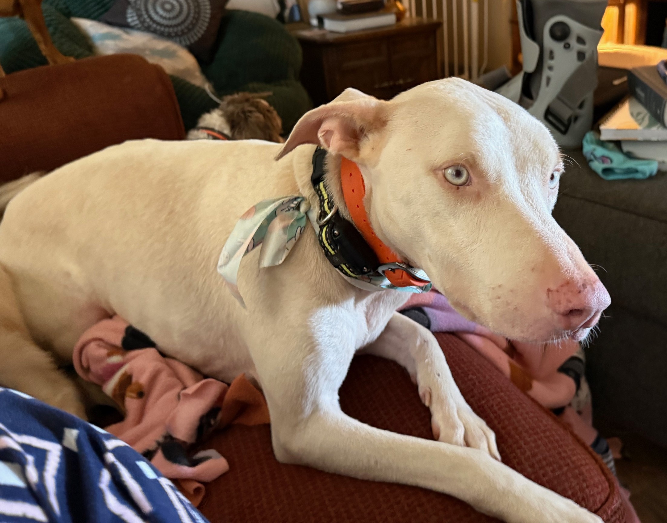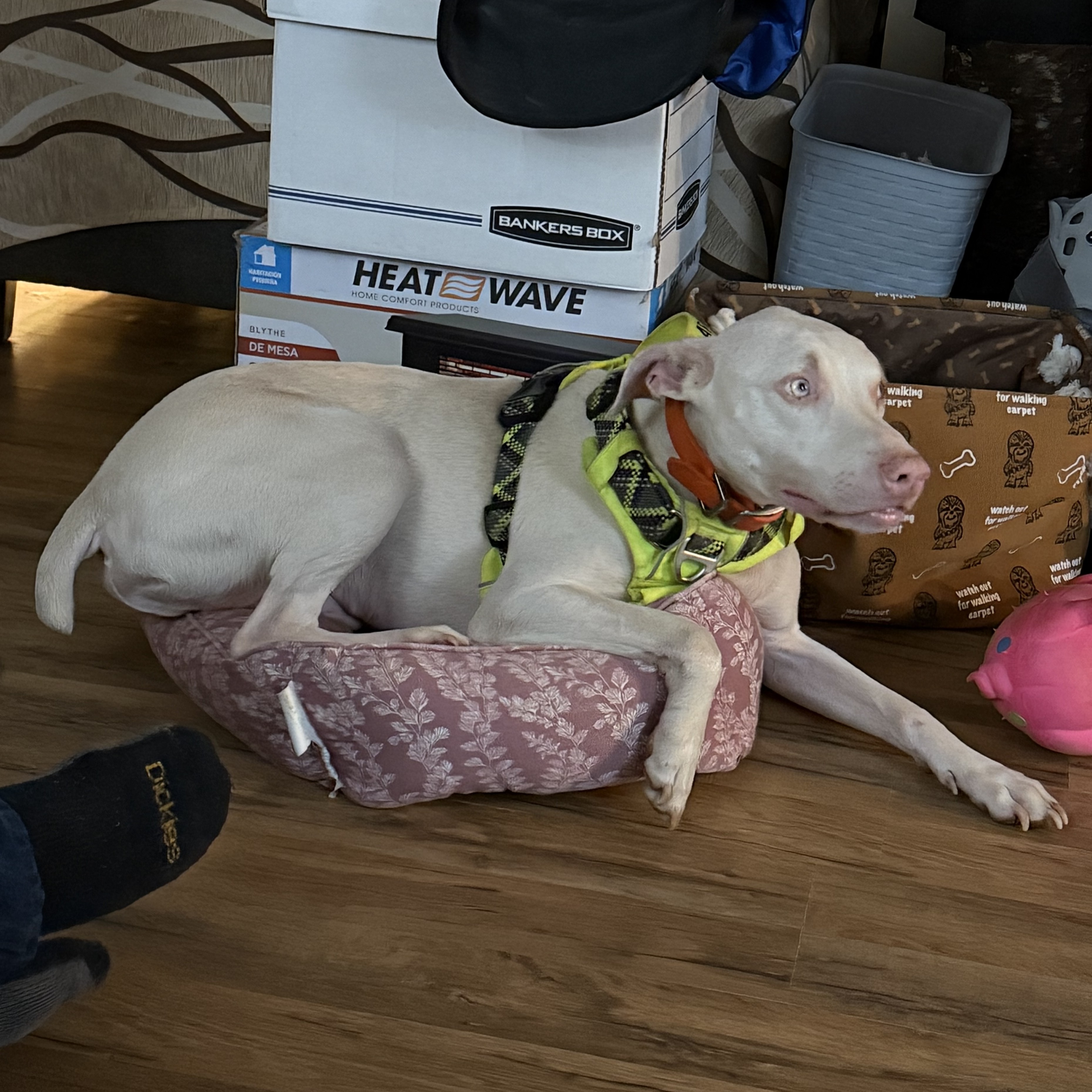 Wednesday, April 08, 2026Sven is a Great Dane and albino pit mix, about 7 years old and 50 pounds. He is house trained, crate trained, up to date on all vaccines, microchipped, and neutered. He is calm, sweet and very loyal. He is a well-behaved boy and knows basic commands. He enjoys snuggling under covers, running around the yard, and playing with toys by himself. He may pull a bit on a leash, because he gets so excited about going for a walk! He does best with harness.